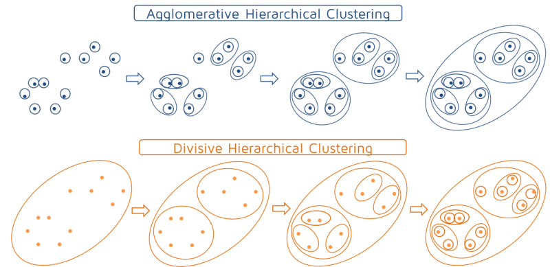 Existen una gran cantidad de métodos de agrupamiento y diferentes tipos de ellos. En esta subsección nos concentraremos, primero, en un método que obtiene los grupos a partir de una sucesión de particiones (agrupamiento jerárquico), y luego, en un método que obtiene los grupos a partir de la cantidad de grupos deseados, unos puntos iniciales y un criterio de parada (agrupamiento directo).