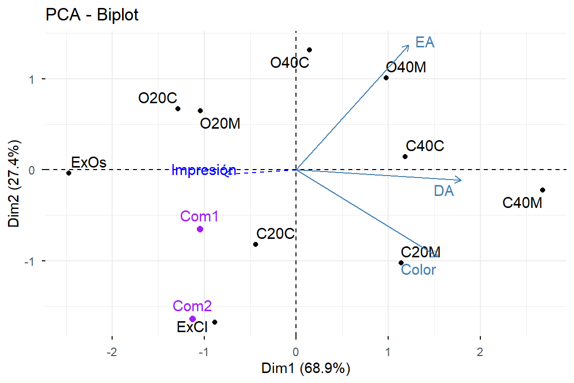 Se usa una identificación nemotécnica de los individuos, que corresponden a 2 marcas comerciales de café y a 10 tratamientos del experimento (Agregado: Sin, Maíz, Cebada. Porcentaje del Agregado: 0, 20% y 40%. Grado de tostión: Clara y Oscura).
