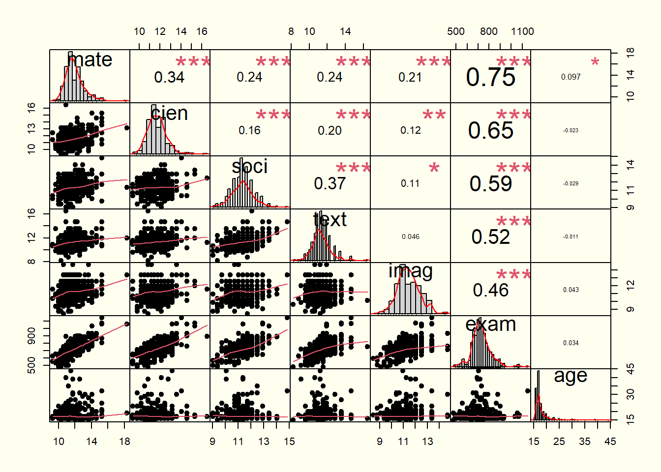 # Si no está cargado, cargar paquete FactoClass:if(!require(FactoClass)){install.packages("FactoClass"); library(FactoClass)}data(admi)# cargar admitidos de FactoClassY<-admi[, c(2:6,7,15)]plotpairs(Y, 7)