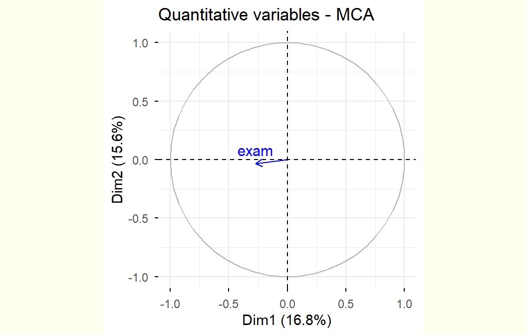 # Gráfico del plano factorial 3,2s.corcircle(acp$co, xax =3, yax =2)s.arrow(Gexam, xax =3, yax =2, add.plot =TRUE, boxes =FALSE)